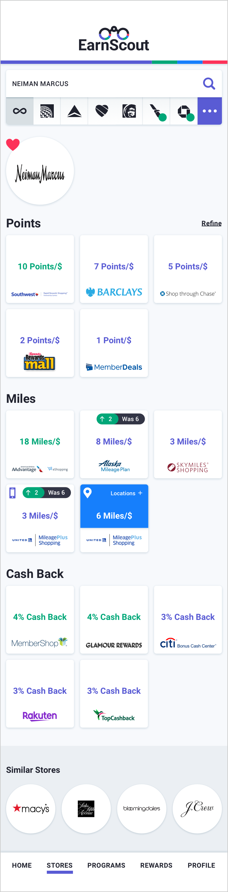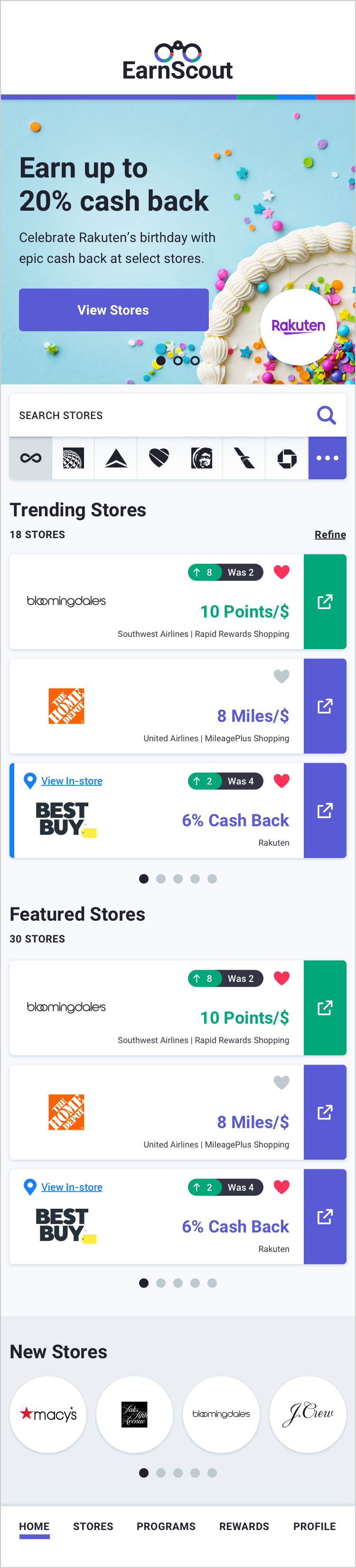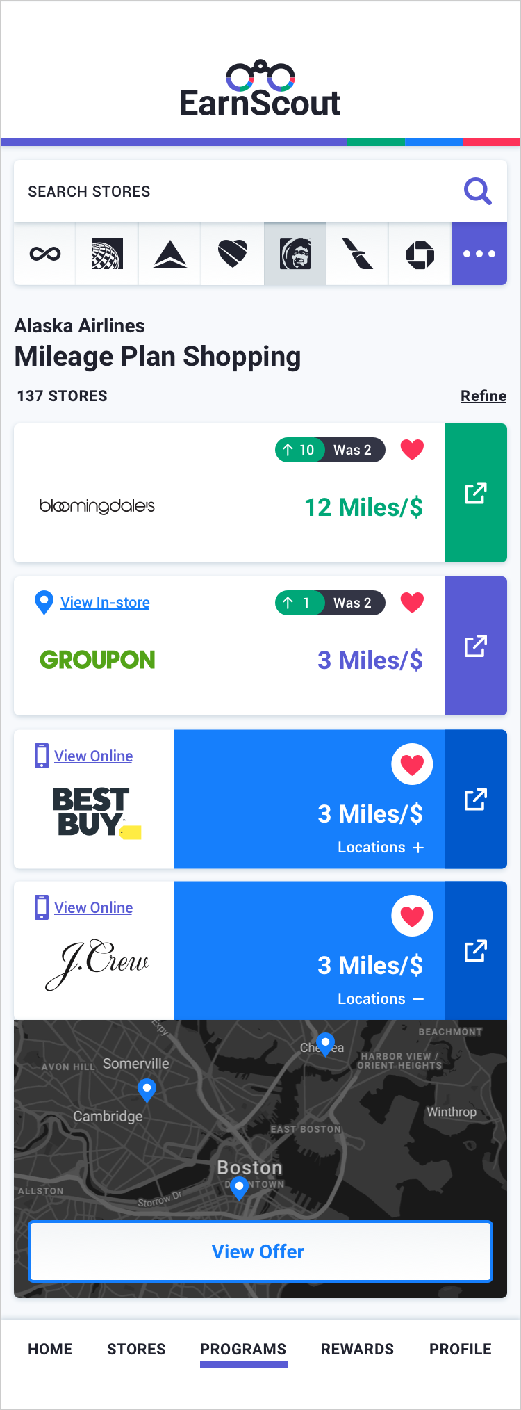 EarnScout is a rewards comparison mobile application developed during a three-day hackathon. During this hackathon, I wanted to solve for creating a non-biased rewards comparison tool in an easily digestible mobile format. Not only was the entire brand created in three days, but also a fully prototyped UI. Through EarnScout, customers can search by store or rewards program utilizing various filters to display the top earnings by reward type (shown in green). Additionally, users can compare elevated offers and view available rewards both in-store and online.