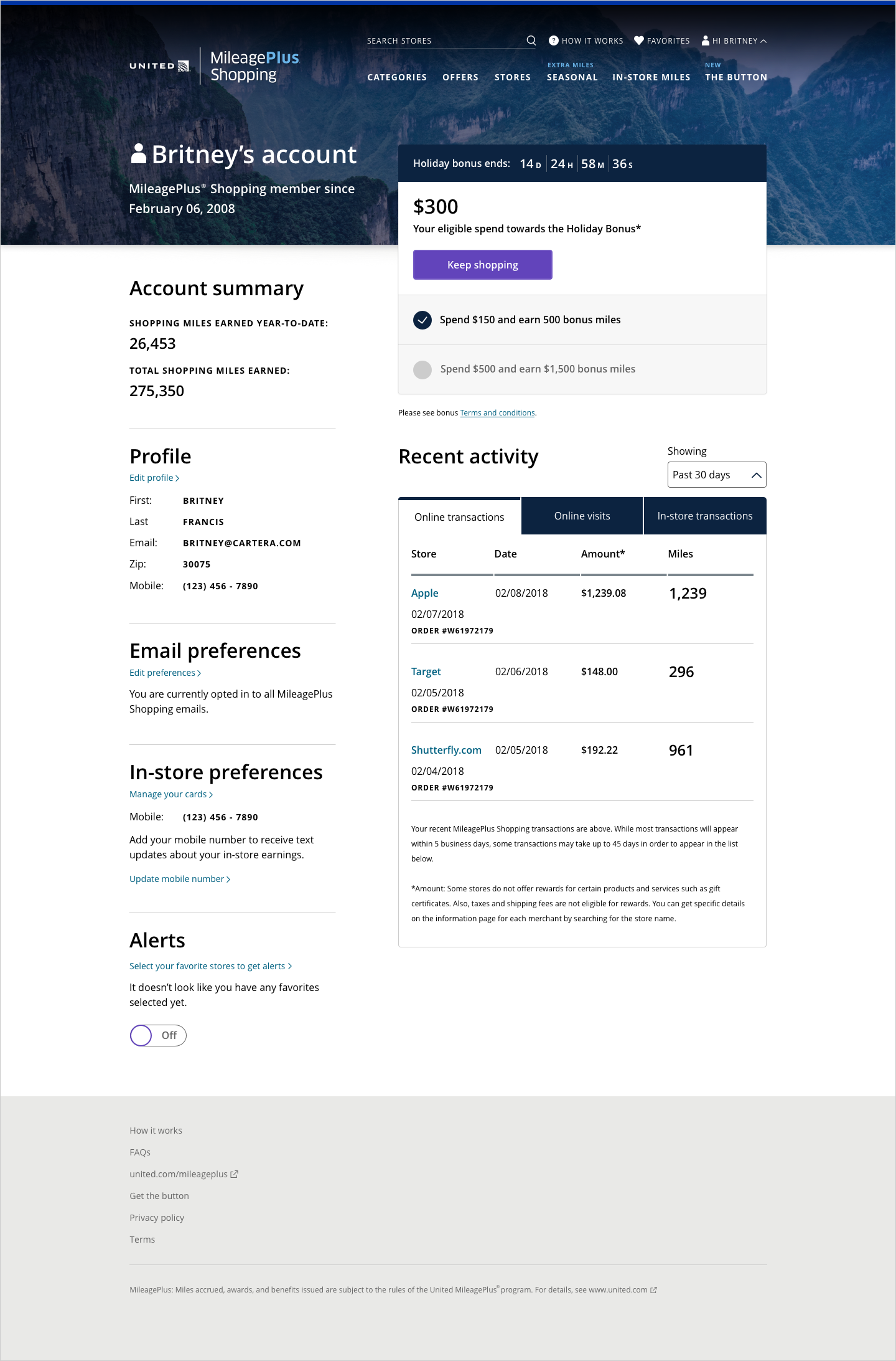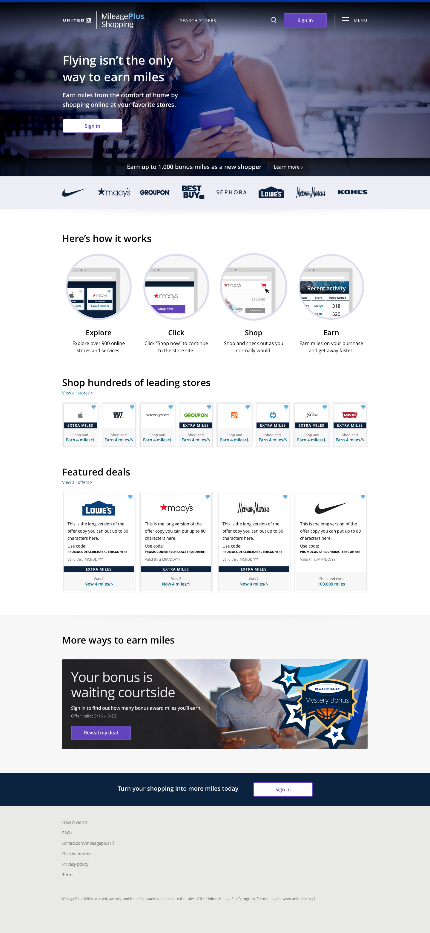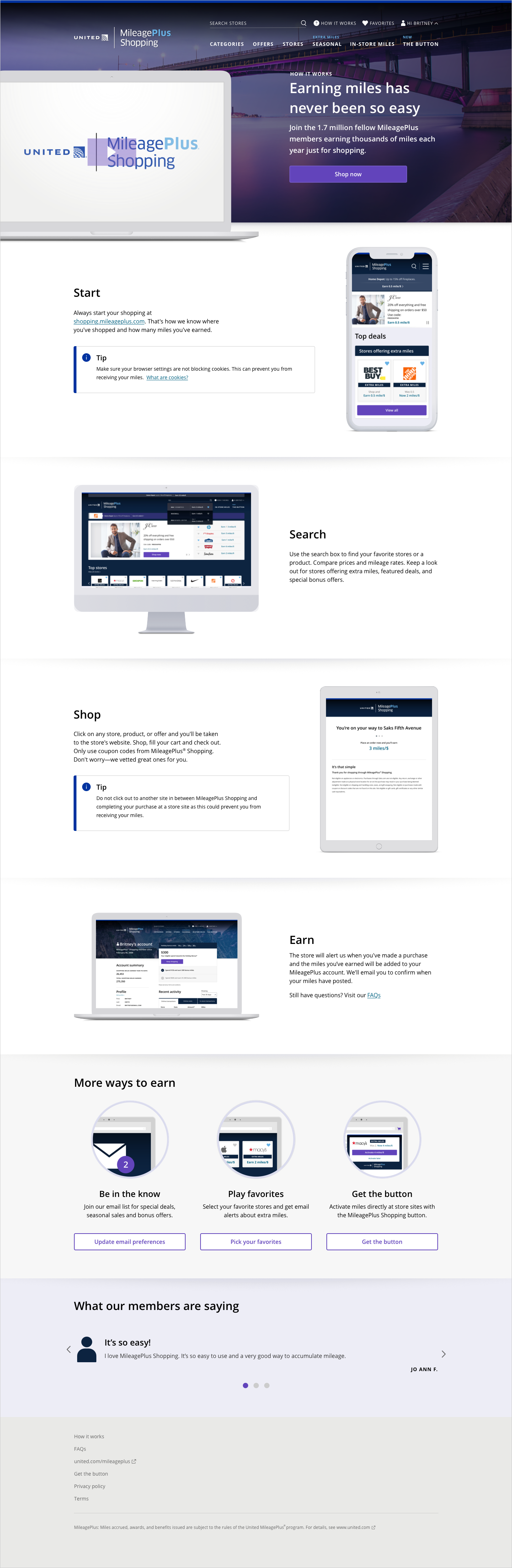 United Airlines MileagePlus Shopping is an online shopping site that allows members to earn miles on every dollar of their purchases at over 950 retailers. United underwent a rebrand in 2019 that required the MileagePlus Shopping partner site to be updated. It was important that the update respect the airline’s new brand guide, while also adhere to the current parameters of the site’s core platform. The site is designed with fully responsive behavior.